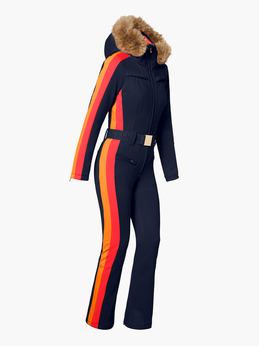 Softshell-Skianzug mit Kapuze, kontrastierenden Streifen und Kunstfellbesatz